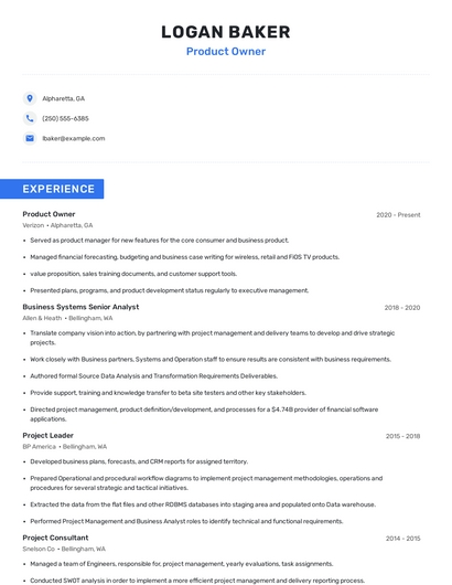 Build a professional product owner resume in minutes. Browse through our resume examples to identify the best way to word your resume. Then choose from 5+ resume templates to create your product owner resume.