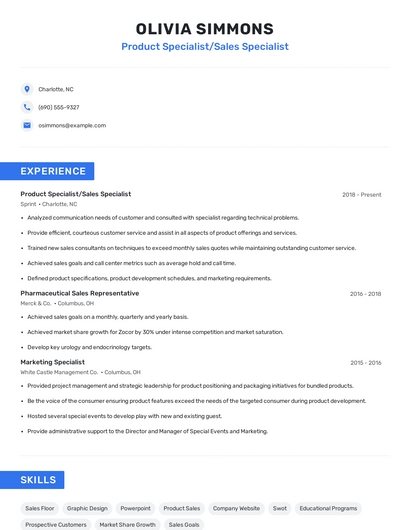 Build a professional product specialist/sales specialist resume in minutes. Browse through our resume examples to identify the best way to word your resume. Then choose from 5+ resume templates to create your product specialist/sales specialist resume.