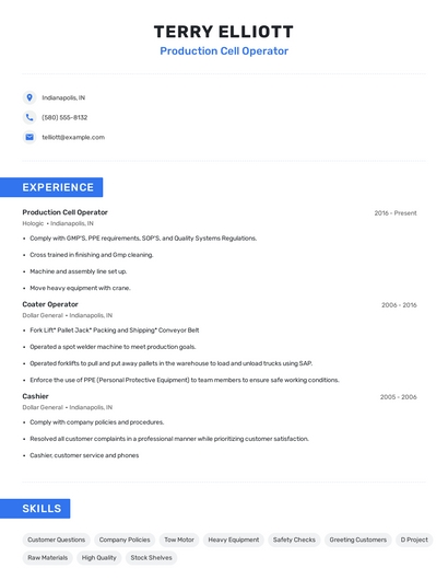 Build a professional production cell operator resume in minutes. Our AI resume writing assistant will guide you through every step of the process, and you can choose from 10+ resume templates to create your production cell operator resume.7. Product Quality