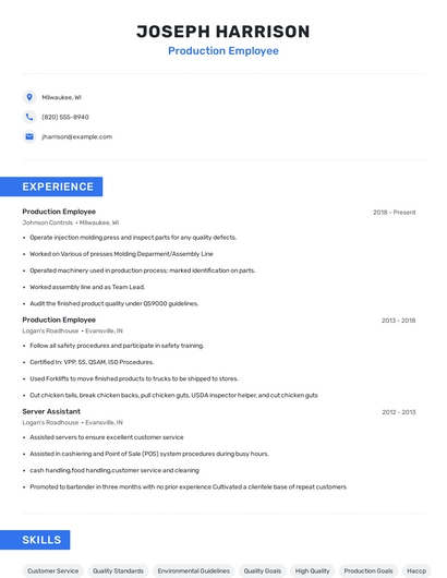 Build a professional production employee resume in minutes. Browse through our resume examples to identify the best way to word your resume. Then choose from 5+ resume templates to create your production employee resume.