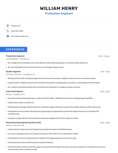 Build a professional production engineer resume in minutes. Browse through our resume examples to identify the best way to word your resume. Then choose from 5+ resume templates to create your production engineer resume.
