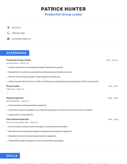 Build a professional production group leader resume in minutes. Browse through our resume examples to identify the best way to word your resume. Then choose from 5+ resume templates to create your production group leader resume.
