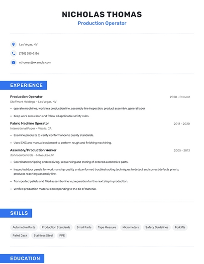 Build a professional production operator resume in minutes. Browse through our resume examples to identify the best way to word your resume. Then choose from 5+ resume templates to create your production operator resume.
