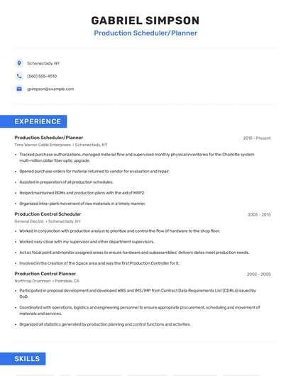 Build a professional production scheduler/planner resume in minutes. Browse through our resume examples to identify the best way to word your resume. Then choose from 5+ resume templates to create your production scheduler/planner resume.