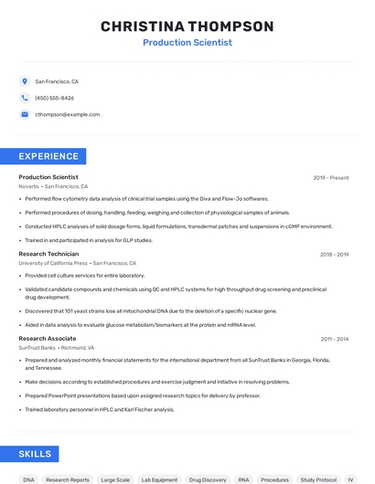 Build a professional production scientist resume in minutes. Browse through our resume examples to identify the best way to word your resume. Then choose from 5+ resume templates to create your production scientist resume.