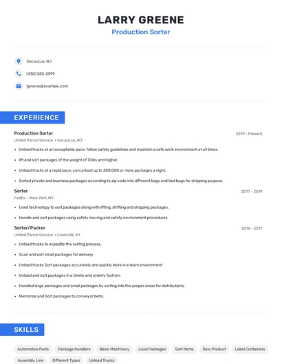 The most important skills for a production sorter resume and required skills for a production sorter to have include:
