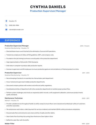 Build a professional production supervisor/manager resume in minutes. Browse through our resume examples to identify the best way to word your resume. Then choose from 5+ resume templates to create your production supervisor/manager resume.