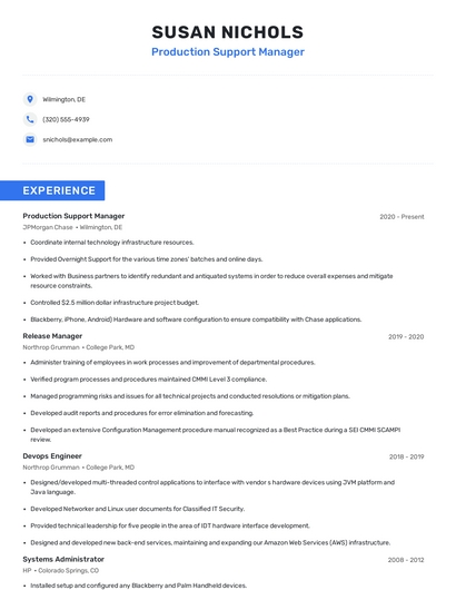 Build a professional production support manager resume in minutes. Browse through our resume examples to identify the best way to word your resume. Then choose from 5+ resume templates to create your production support manager resume.