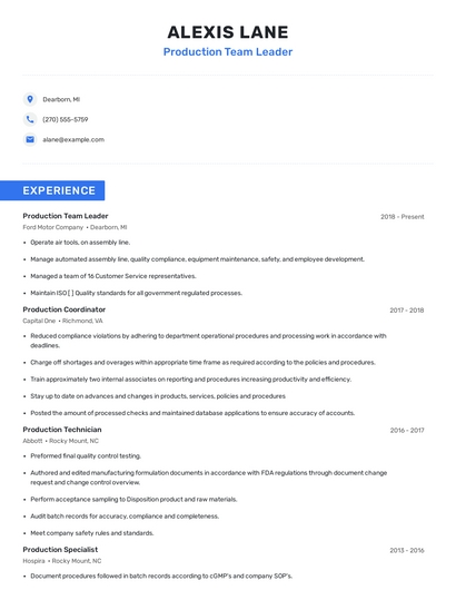 Build a professional production team leader resume in minutes. Browse through our resume examples to identify the best way to word your resume. Then choose from 5+ resume templates to create your production team leader resume.