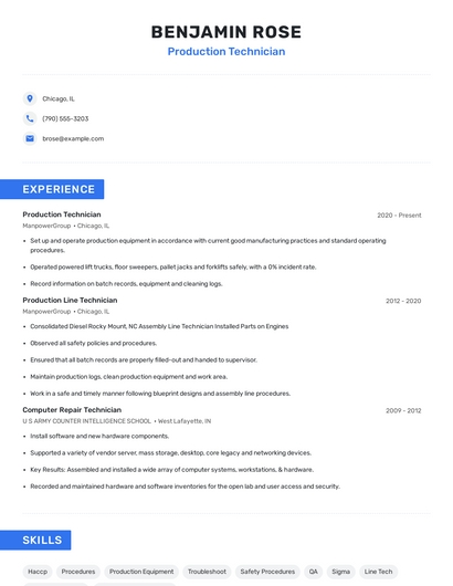 Build a professional production technician resume in minutes. Browse through our resume examples to identify the best way to word your resume. Then choose from 5+ resume templates to create your production technician resume.