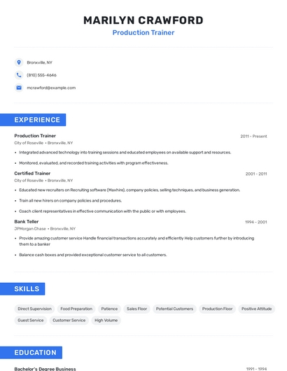 Build a professional production trainer resume in minutes. Browse through our resume examples to identify the best way to word your resume. Then choose from 5+ resume templates to create your production trainer resume.