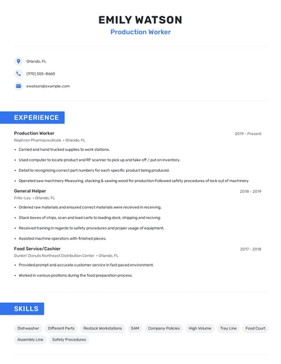 Build a professional production worker resume in minutes. Browse through our resume examples to identify the best way to word your resume. Then choose from 5+ resume templates to create your production worker resume.