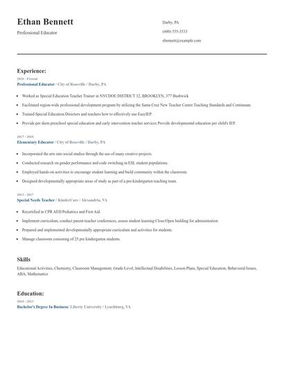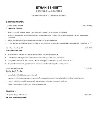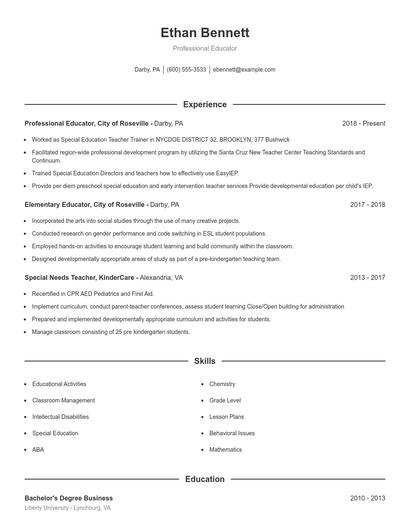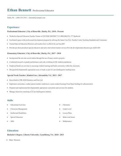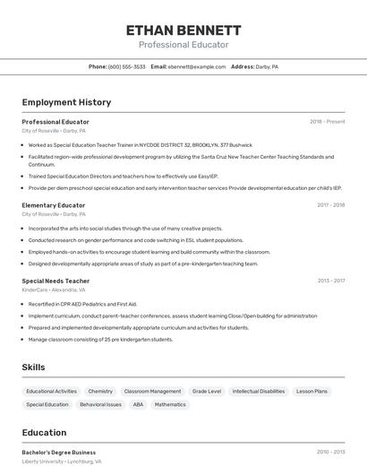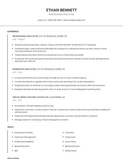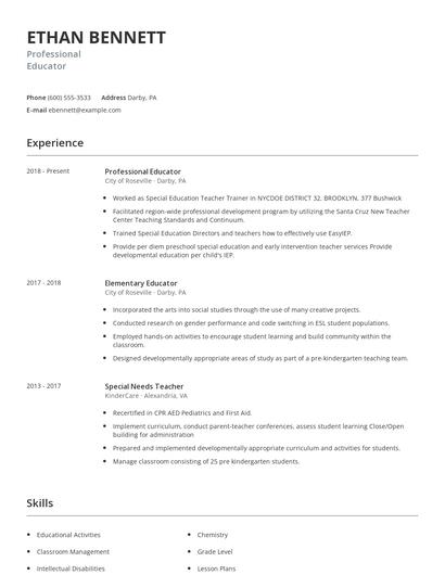 Build a professional professional educator resume in minutes. Our AI resume writing assistant will guide you through every step of the process, and you can choose from 10+ resume templates to create your professional educator resume.Compare different professional educators
