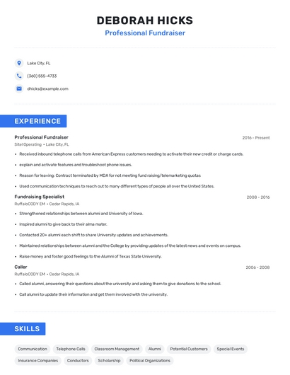 Build a professional professional fundraiser resume in minutes. Browse through our resume examples to identify the best way to word your resume. Then choose from 5+ resume templates to create your professional fundraiser resume.