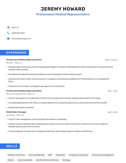 Build a professional professional medical representative resume in minutes. Browse through our resume examples to identify the best way to word your resume. Then choose from 5+ resume templates to create your professional medical representative resume.