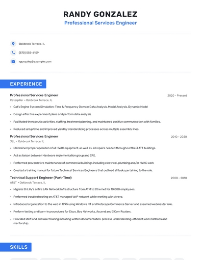 Build a professional professional services engineer resume in minutes. Browse through our resume examples to identify the best way to word your resume. Then choose from 5+ resume templates to create your professional services engineer resume.