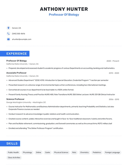 Build a professional professor of biology resume in minutes. Browse through our resume examples to identify the best way to word your resume. Then choose from 5+ resume templates to create your professor of biology resume.