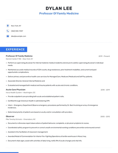 Build a professional professor of family medicine resume in minutes. Browse through our resume examples to identify the best way to word your resume. Then choose from 5+ resume templates to create your professor of family medicine resume.