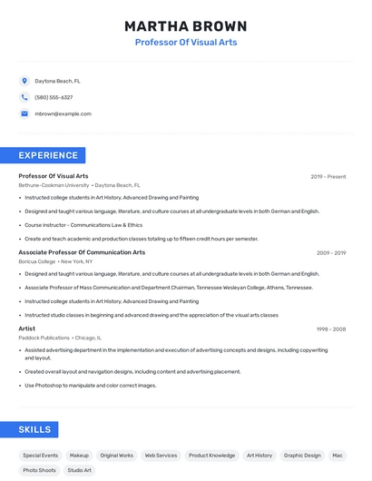 Build a professional professor of visual arts resume in minutes. Our AI resume writing assistant will guide you through every step of the process, and you can choose from 10+ resume templates to create your professor of visual arts resume.What skills help Professors Of Visual Arts find jobs?