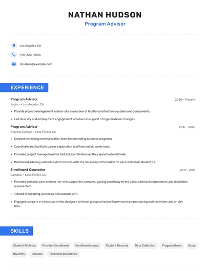 Build a professional program advisor resume in minutes. Browse through our resume examples to identify the best way to word your resume. Then choose from 5+ resume templates to create your program advisor resume.
