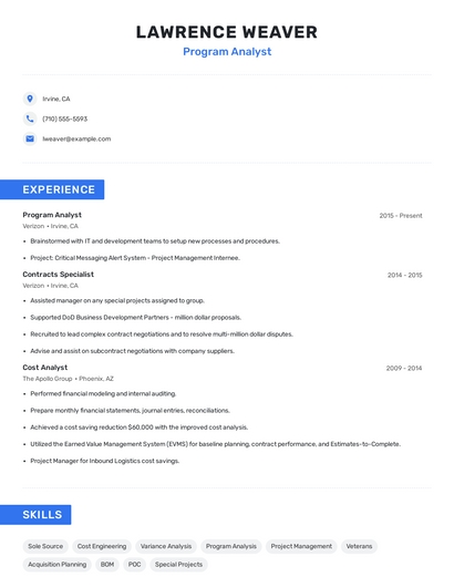 Build a professional program analyst resume in minutes. Browse through our resume examples to identify the best way to word your resume. Then choose from 5+ resume templates to create your program analyst resume.