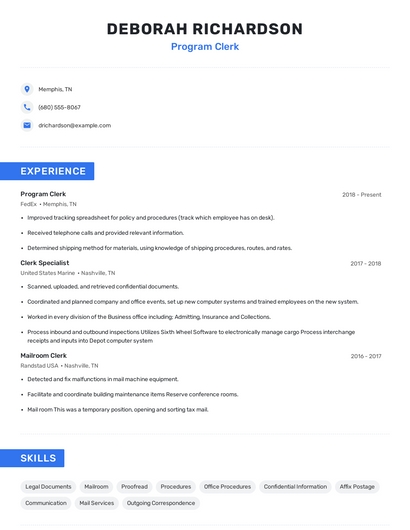 Build a professional program clerk resume in minutes. Browse through our resume examples to identify the best way to word your resume. Then choose from 5+ resume templates to create your program clerk resume.