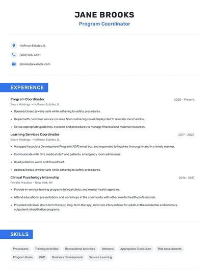 Build a professional program coordinator resume in minutes. Browse through our resume examples to identify the best way to word your resume. Then choose from 5+ resume templates to create your program coordinator resume.