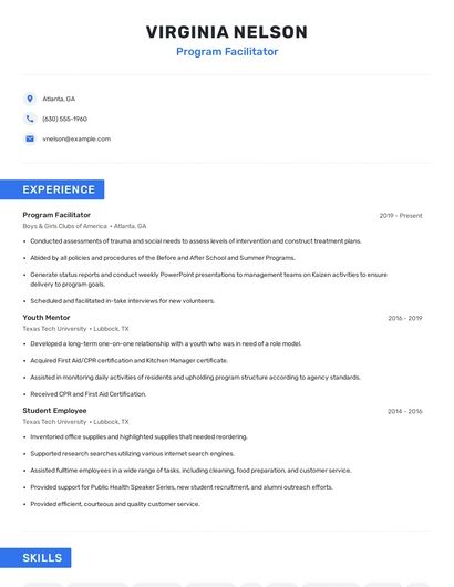 Build a professional program facilitator resume in minutes. Browse through our resume examples to identify the best way to word your resume. Then choose from 5+ resume templates to create your program facilitator resume.