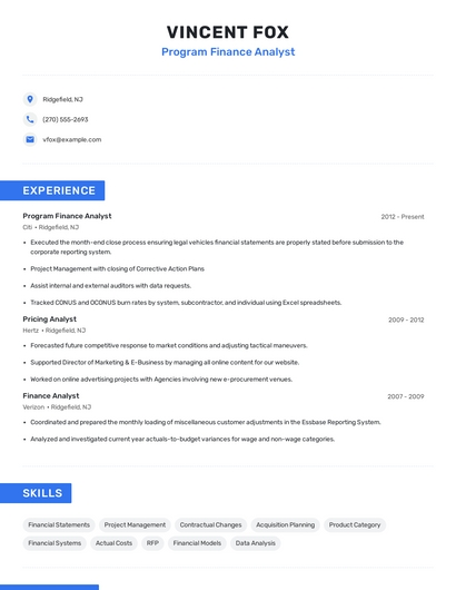Build a professional program finance analyst resume in minutes. Browse through our resume examples to identify the best way to word your resume. Then choose from 5+ resume templates to create your program finance analyst resume.