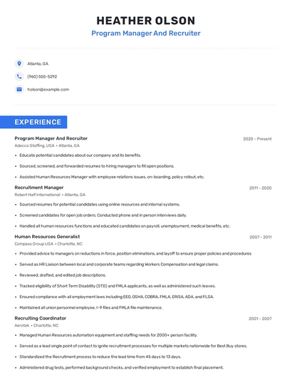 Build a professional program manager and recruiter resume in minutes. Browse through our resume examples to identify the best way to word your resume. Then choose from 5+ resume templates to create your program manager and recruiter resume.