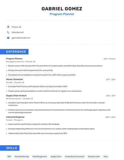 Build a professional program planner resume in minutes. Browse through our resume examples to identify the best way to word your resume. Then choose from 5+ resume templates to create your program planner resume.