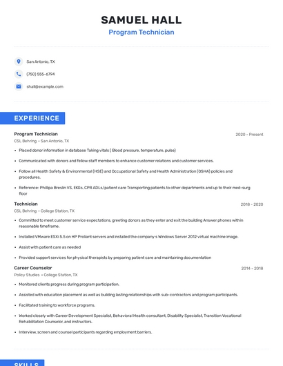 Build a professional program technician resume in minutes. Browse through our resume examples to identify the best way to word your resume. Then choose from 5+ resume templates to create your program technician resume.