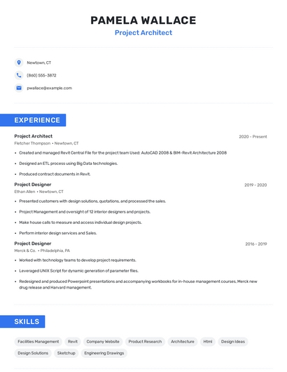 Build a professional project architect resume in minutes. Browse through our resume examples to identify the best way to word your resume. Then choose from 5+ resume templates to create your project architect resume.