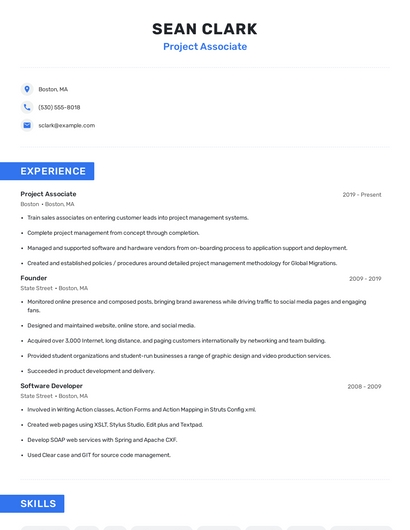 Build a professional project associate resume in minutes. Browse through our resume examples to identify the best way to word your resume. Then choose from 5+ resume templates to create your project associate resume.