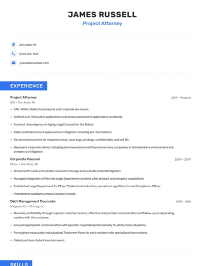 Build a professional project attorney resume in minutes. Browse through our resume examples to identify the best way to word your resume. Then choose from 5+ resume templates to create your project attorney resume.