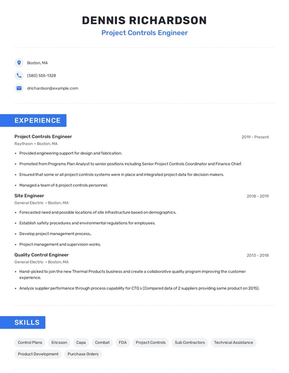 Build a professional project controls engineer resume in minutes. Browse through our resume examples to identify the best way to word your resume. Then choose from 5+ resume templates to create your project controls engineer resume.