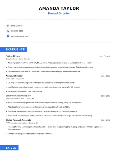 Build a professional project director resume in minutes. Browse through our resume examples to identify the best way to word your resume. Then choose from 5+ resume templates to create your project director resume.