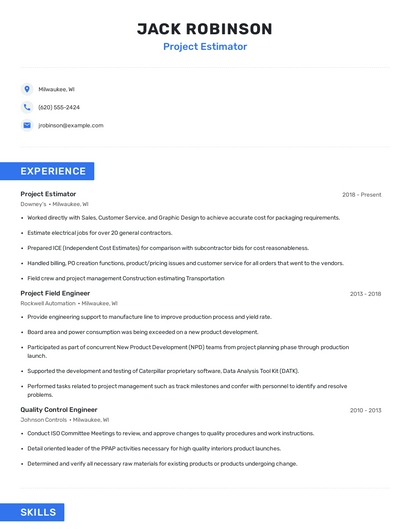 Build a professional project estimator resume in minutes. Browse through our resume examples to identify the best way to word your resume. Then choose from 5+ resume templates to create your project estimator resume.