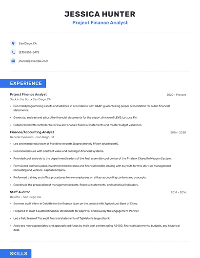 Build a professional project finance analyst resume in minutes. Browse through our resume examples to identify the best way to word your resume. Then choose from 5+ resume templates to create your project finance analyst resume.