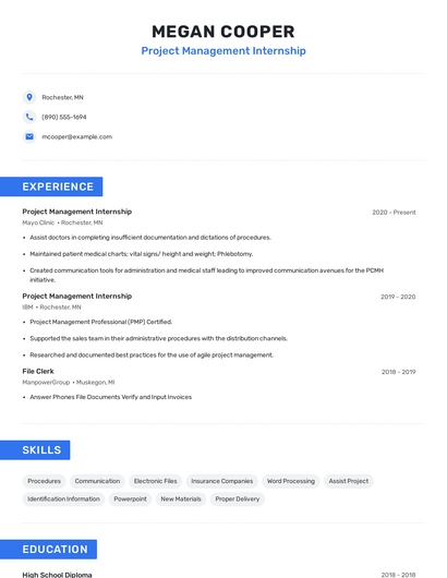 Build a professional project management internship resume in minutes. Browse through our resume examples to identify the best way to word your resume. Then choose from 5+ resume templates to create your project management internship resume.