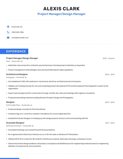 Build a professional project manager/design manager resume in minutes. Browse through our resume examples to identify the best way to word your resume. Then choose from 5+ resume templates to create your project manager/design manager resume.