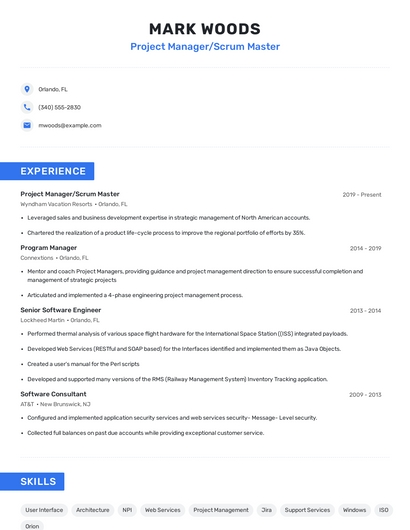 Build a professional project manager/scrum master resume in minutes. Browse through our resume examples to identify the best way to word your resume. Then choose from 5+ resume templates to create your project manager/scrum master resume.