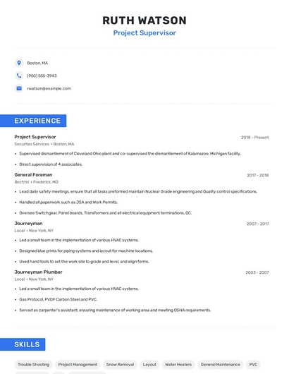 Build a professional project supervisor resume in minutes. Our AI resume writing assistant will guide you through every step of the process, and you can choose from 10+ resume templates to create your project supervisor resume.7. Plumbing