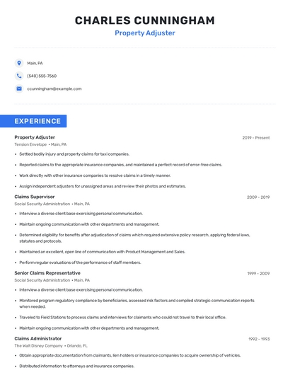 Build a professional property adjuster resume in minutes. Browse through our resume examples to identify the best way to word your resume. Then choose from 5+ resume templates to create your property adjuster resume.