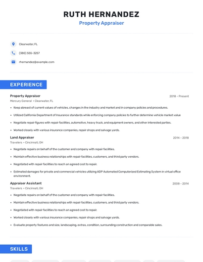 Build a professional property appraiser resume in minutes. Browse through our resume examples to identify the best way to word your resume. Then choose from 5+ resume templates to create your property appraiser resume.