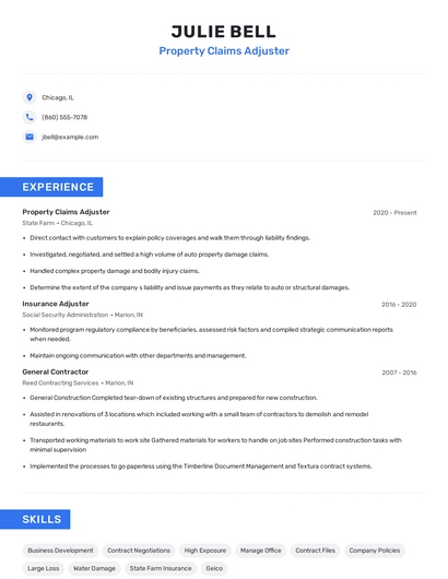 Build a professional property claims adjuster resume in minutes. Browse through our resume examples to identify the best way to word your resume. Then choose from 5+ resume templates to create your property claims adjuster resume.