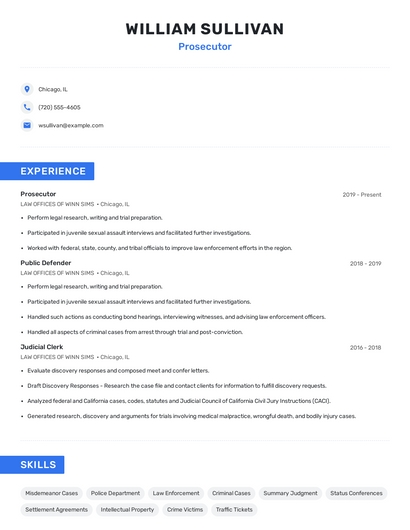 Build a professional prosecutor resume in minutes. Browse through our resume examples to identify the best way to word your resume. Then choose from 5+ resume templates to create your prosecutor resume.