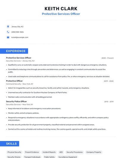 Build a professional protective services officer resume in minutes. Browse through our resume examples to identify the best way to word your resume. Then choose from 5+ resume templates to create your protective services officer resume.