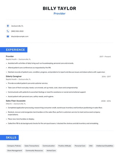 Build a professional provider resume in minutes. Browse through our resume examples to identify the best way to word your resume. Then choose from 5+ resume templates to create your provider resume.