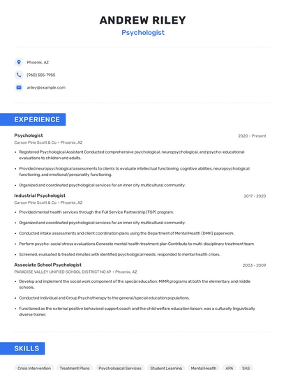 Build a professional psychologist resume in minutes. Browse through our resume examples to identify the best way to word your resume. Then choose from 5+ resume templates to create your psychologist resume.